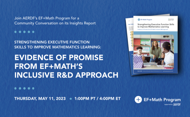 On May 11, 2023, AERDF and EF+Math will convene an incredible panel of educators, researchers, district partner leaders, and developers to discuss EF+Math's recently released Insights Report, Strengthening Executive Function Skills to Improve Mathematics Learning: Evidence of Promise from EF+Math's Inclusive R&D Approach<https://aerdf.dspacedirect.org/server/api/core/bitstreams/db6cabfd-1662-43c9-956f-c8a3c42b547a/content>. This community conversation<https://www.eventbrite.com/e/community-conversation-on-the-efmath-insights-report-tickets-619279149607> will help participants gain a deeper understanding of EF+Math's insights, including early evidence from across its portfolio that demonstrates the promise of the unique math learning approaches and research tools its community is developing and researching. The conversation will also focus on how education experiences that are equity centered, based on learning science, and co-designed by educators, researchers, and developers have the promise of dramatically improving mathematics outcomes for Black and Latinx students and students of all races experiencing poverty. The format of the event will be a 40-minute panel discussion followed by 20-minute small group breakout conversations on the topics of (1) inclusive research and development processes, (2) understanding the relationship between mathematics and executive function, and (3) equity in math education R&D. You will have the opportunity to select which small group discussion you would like to engage in. Be sure to save your spot<https://www.eventbrite.com/e/community-conversation-on-the-efmath-insights-report-tickets-619279149607> early and invite your colleagues to join us as this is a public event! Please consider submitting a question in advance on the registration form.